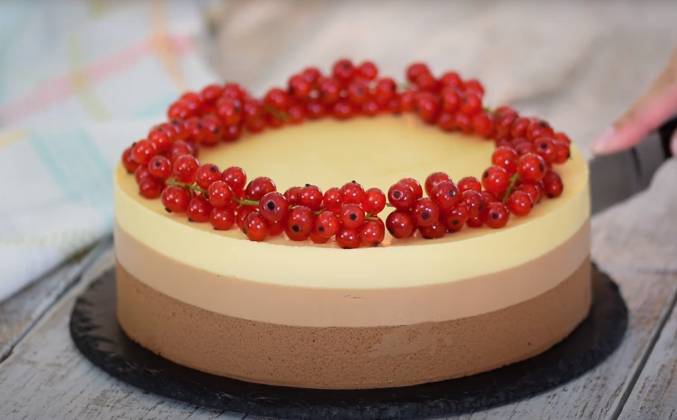 6. В миску с молочным шоколадом добавить растопленный желатин и хорошо перемешать, затем добавить 150 грамм взбитых сливок и перемешать до однородности. Достать форму из холодильника и вылить мусс из молочного шоколада. Убрать в холодильник на 20 минут. Повторить все тоже с массой из белого шоколада. Убрать торт в холодильник на 6 часов. Готовый торт вынуть из формы, переложить на блюдо и украсить красной смородиной. Приятного аппетита!Видео рецепт ютуб ниже 👇