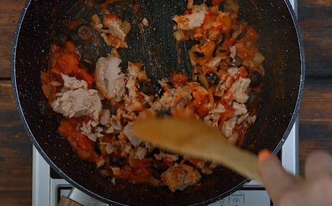 3. Хорошенько перемешай. Добавь маслины, перемешай и потуши ещё 3 минуты. Отправь на сковородку консервированный тунец, перемешай и туши не больше минуты. К готовому соусу добавь пасту и перемешай. Ну вот и всё! Можно раскладывать блюдо по тарелкам. Посыпь пасту тёртым сыром, укрась зеленью и подавай с белым сухим вином!Видео рецепт ютуб ниже 👇