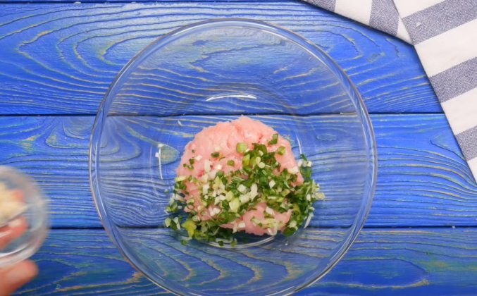 2. В это время готовлю начинку: мелко нарезаю зеленый лук. Отделяю половину нарезанного лука и еще больше ее измельчаю. Измельченный лук перекладываю в емкость к куриному фаршу. Также сюда добавляю измельченный зубчик чеснока и соевый соус. Фарш тщательно вымешиваю. Баклажаны вынимаю из воды и слегка обсушиваю полотенцем. Начиняю их подготовленным куриным фаршем. Вот такие чудесные полосатики у меня получились. Готовить их буду на пару, выкладываю в лоток мультиварки.
