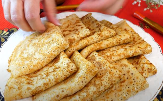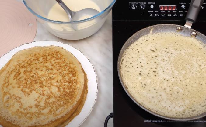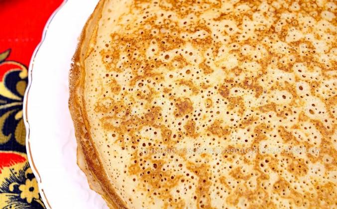 4. Наливаем тесто на сухую, не смазанную сковородку и видим такой же красивый ажурный рисунок с множеством дырочек, переворачиваем блинчик, а на обратной стороне он более ровный и однородный. Снимаются блины хорошо и можно сказать, что практически ничем не отличаются от тех, что выпекались на смазанной сковороде - в общем, выбор за вами, если конечно, ваша сковорода позволяет жарить без масла! Итак, из этого количества теста получается 22 блинчика диаметром 20 см. Надеюсь, что мои рецепты, советы и подсказки пригодятся вам не только в Масленицу, но и в вашем повседневном кулинарном творчестве!Видео рецепт ютуб ниже 👇
