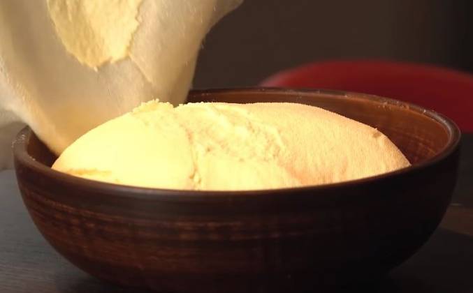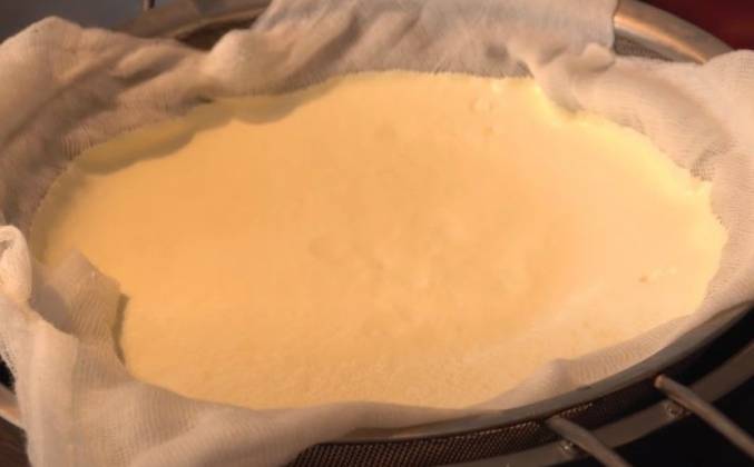 3. По мне - либо мы пользуем термометр, либо не морочим никому голову этими следами. Вливаем, в общем, постепенно лимонный сок. Смотрите не ляпните как я. И, в одном направлении, медленно перемешиваем. Поменяете направление - будете прокляты. Помешаем так несколько минут, пока не начнётся разделение на крупинки. Убираем кастрюльку с огня и можем поставить ее сразу же ледяную воду, ну чтобы сливки остыли. Или перелейте в другую миску, так будет быстрее, но мне лень потом мыть две. Затем берём сито или дуршлаг, миску, и стерильную марлю, сложённую раза в 3-4. Переливаем нашу остывшую смесь. Затем накрываем крышкой - и в холодильник (6-8 часов минимум, лучше на ночь). Вы же не встаете в 4-5 утра.