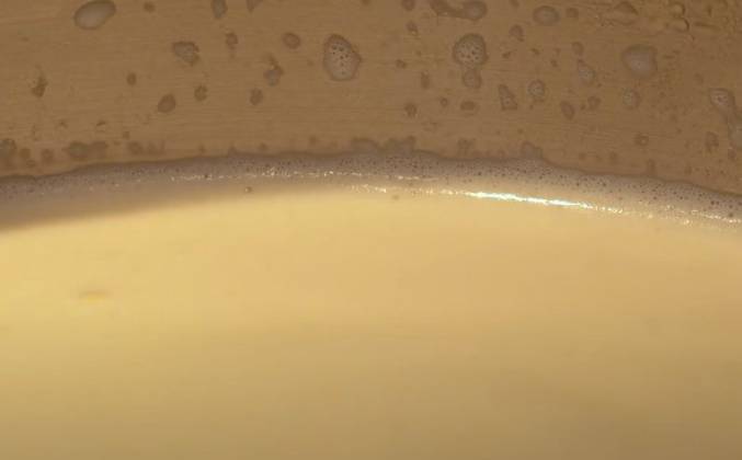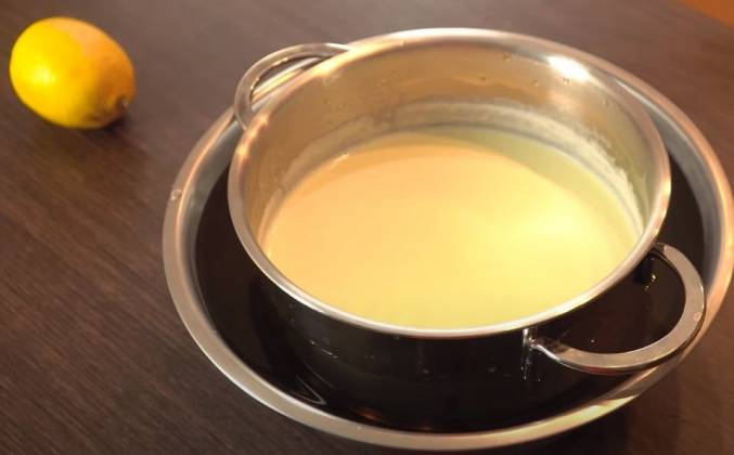 2. Ставим ее на средний огонь. Спокойно помешиваем, деревянной ложкой или венчиком. Задача - довести до начала кипения, но не кипятить. Можно делать с термометром, конечно (не больше 85°C), но у кого он есть? У меня - есть. Но я буду с вами солидарен. Пока не начало закипать - подготовьте 2 ст. ложки свежевыжатого лимонного сока. Если используете сок из бутылки, то заранее достаньте его из холодильника. Он должен быть комнатной температуры. Как только начались маленькие.. эмм.. пузырики? Черти шо. Бульбашки в общем, по краям кастрюли, сразу огонь ниже среднего. Кипеть не должно! Для проверки можно использовать ложку. Что-то там должно стекать, какой-то след. Я понятия не имею как это работает. Серьезно.