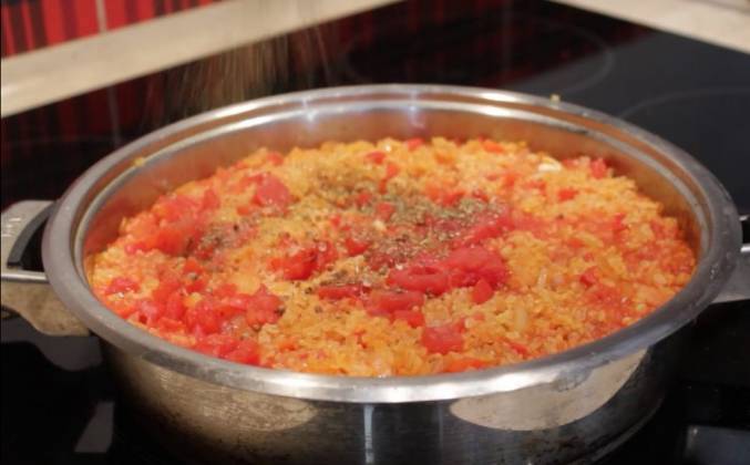 3. Промоем и скинем на мелкое сито, пока овощи пассеруются. В ответ на ваш вопрос булгур - это вкуснятина. И не надо бояться новых слов. Булгур - это самая обыкновенная раздробленная пшеница, которая прошла тепловую обработку и затем была высушена до состояния вот таких золотых камешков. Кстати, стоит дешевле гречки. Промытую экс-пшеницу высыпаем к овощам и перемешиваем, и тут же принимаемя за томаты. Конечно вы можете взять 4-5 шт. свежих томатов, протереть их через терку до шкурки сразу в сковороду, и будет супер, но.. это в идеальном варианте, если ваши томаты пахнут как лето, а не резина как у нас сейчас..