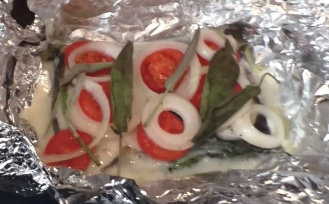 3. Форму любую застелите фольгой - и чище будет, и вкус и сок останется внутри. И отправляйте нагреваться вместе с духовкой, нечего ей тут под руками путаться. Духовка уже дошла до 180, форма раскалена. Пару капель маслеца. Быстроенько еще раз промокнем рыбку, укладываем ее на фольгу. Соль, самую малость. Смчп. Сверху лук, помидоры. Не время художничать, Сергей Юрьевич, гастрит ждать не будет. Травы-муравы, заворачиваем в сверток и в печь. Эх, хотел я показать вам как пожарить отличный стейк из этой рыбы, но в другой раз. Вашему любимому ведущему сейчас можно только диетическое. Ничего острого, копченого, соленого, жареного и жирного. В основном в духовке или на пару. Сопли в общем. Так что потерпите.