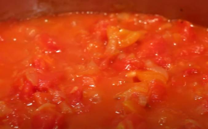 3. Если вы не добавляли перец Чили, на данном этапе можно добавить на кончике ножа красного острого перца. Снова перемешиваем и оставляем на 15 -20 минут. Тушим до практически полного испарения жидкости. Масса должна загустеть. Возможно, времени понадобится чуть больше. Конечно, вы можете использовать уже консервированные помидоры и уже очищенные. А можете почистить и свежие. Если вы из этих. Если интересно, можете даже посмотреть нас 10-тимесячной давности. Мы там как раз этим занимаемся. Итак, наша масса загустела. Теперь для каждого яйца проделываем ложкой ямку.