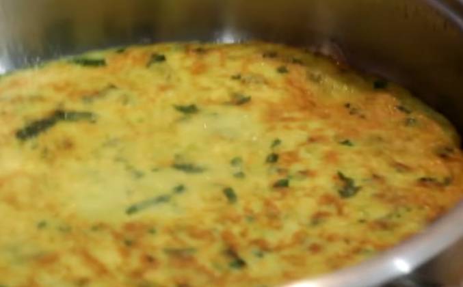 3. Теперь по одной столовой ложке добавляем муку, после каждой ложки тщательно перемешиваем. На эту порцию у нас ушло ровно полстакана муки. Но все зависит от размера кабачка. Тем временем сковорода хорошо прокалилась - это важно! Нальем немного растительного масла. Дадим ему прогреться секунд 10 и вываливаем нашу кабачковую смесь. Разравниваем ее хорошенько по сковороде. Тут же накрываем крышкой и засекаем 5 минут. Спустя 5 минут открываем, и для удобства, чтобы омлет не порвался, перекидываем его на тарелку. Накрываем другой тарелкой, переворачиваем и обратно скидываем в сковороду. На этих же тарелках потом подадите, так что не беда.