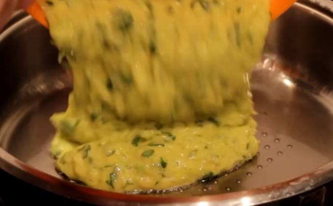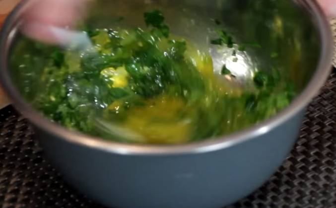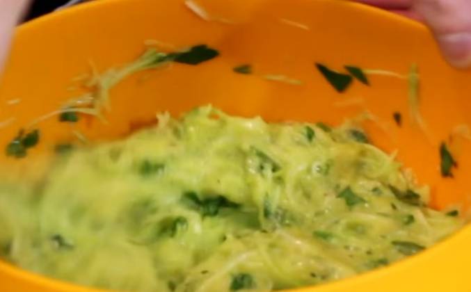 2. Нарезаем небольшой пучок любой зелени, мы взяли петрушку. В отдельную миску разбиваем два яйца, сюда добавляем хорошую щепотку соли, свежемолотый черный перец и можно немного сухого чеснока, если есть. Слегка поколотим яйцо, высыпаем петрушку, перемешаем и всю эту смесь выливаем к нашим кабачкам. Тщательно вилкой перемешиваем-взбиваем, по желанию в смесь можно добавить натертую морковку или же лук. Кстати, в данном рецепте сок с кабачков мы НЕ отжимаем.