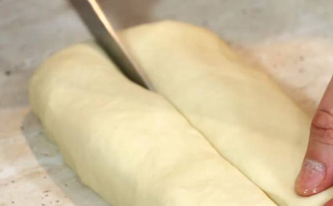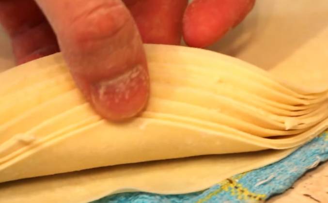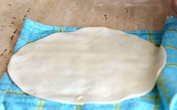 3. В разрезе оно будет выглядеть вот так. Накрываем пленкой или полотенцем, и пусть «отдохнут» минут 15. Отдохнут! Термин придумали, да? Им то от чего отдыхать?! Это мы его месили - нам нужно отдыхать. Ну не суть.. 15 минут прошло, теперь тесто будет очень легко раскатываться. Обязательно присыпаем стол мукой, сверху лепешку и еще немного муки. Можно немного муки и на скалку. Раскатываем его, сначала вверх, потом переворачиваем, снова раскатываем. Стараемся придать форму круга. Но в любом случае, можно взять тарелку и обвести ее. Конечно, смотрите чтобы круг был чуть меньше диаметра вашей сковороды. Это логично.