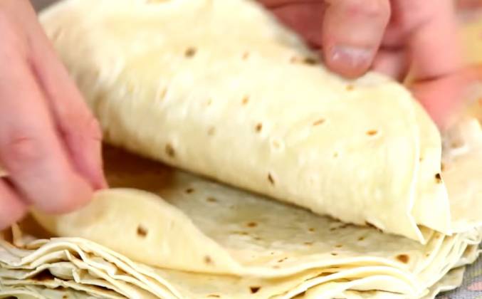 5. Не передержите, иначе, во-первых, лепешки згорят, а во-вторых, будут хрустящие. Жарим еще секунд 15-20, смотрите сами и опять же перекладываем на тарелку с полотенцем и накрываем сверху. А, полотенце с прошлого года. Ну думаю, идею вы поняли. Пшеничные тортильи вы можете использовать вместо хлеба. Кладите их в холодильник, обязательно в целлофановый пакет или же плотно накройте пленкой. Лепешки получатся очень мягкие, особенно если постоят немного под полотенцем, они очень хорошо скручиваются - своего рода лаваш, но домашний. Давайте разорвет одну. Тортильи готовы, Кот спит. Подписывайтесь, ставьте лайки. До свидания!Видео рецепт ютуб ниже 👇