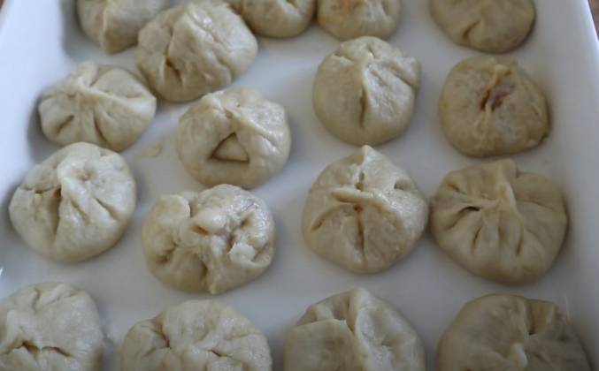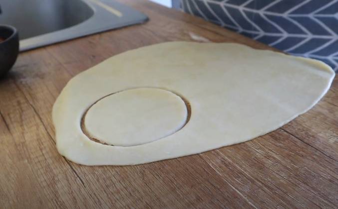2. Мукой поверхность стола можно не присыпать ,т.к. тесто достаточно послушное и не липнет. Стаканом сделать кружочки для будущих печенек. В центр круга положить варенье по одной чайной ложке, (у меня абрикосовое). Варенье лучше брать густое, чтобы оно не вытекало при выпечке. Края теста сложить гармошкой и скрепить таким образом, чтобы получился мешочек, который напоминает «хинкали».