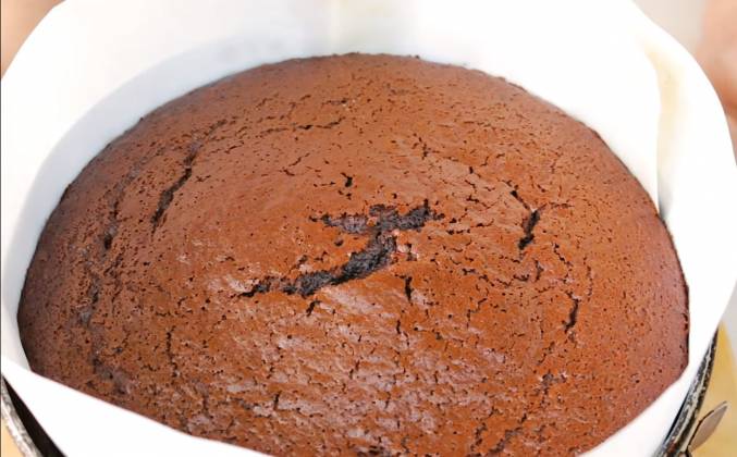 4. Переливаем наше тесто в форму, и будем выпекать в духовке разогретой до 180 градусов, примерно где-то 40 минут, до сухой зубочистки. Если у вас будет форма меньшего диаметра, к примеру 16 сантиметров то данного количества теста вам хватит на корж, который сможете разрезать на три отдельных коржа. У меня 21 сантиметр в диаметре. Разрезать его буду на два коржа. Бисквит выпекался 40 минут. Зубочистка была уже сухой и была такая небольшая вот горочка.