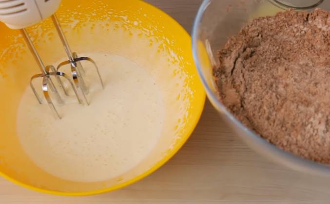 2. Сухие ингредиенты мы будем вводить в два этапа. Скорость миксера должна быть минимальной. Мы должны только перемешивать, а не взбивать. Одну половину мы введём самом начале, на сам маленькой скорости перемешиваем, и тут же тонкой струйкой мы будем вводить молоко с маслом. Добавляем оставшуюся муку и какао, перемешиваем.