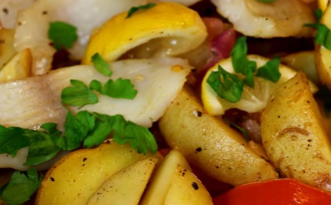 Картошку по-гречески. И наше жаркое из картофеля и рыбы готово. Ну а самое главное, что мы можем смело назвать это блюдо греческим. Это определенно добавит вкуса :) Перед подачей можно притрусить кое-как порубленной петрушкой. А можно и не трусить, если у вас тоже зима и вам было лень тащиться в крупный супермаркет.