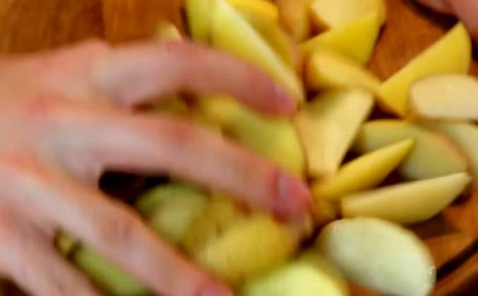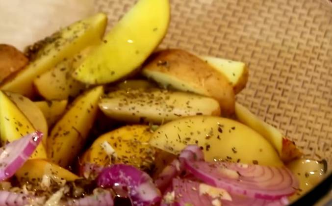 2. Затем два зубчика чеснока придавим ножом, очистим от кожуры и порубим абы-как, но не слишком мелко. Чеснок к картошке, туда же половину чайной ложки сухого орегано. Можете заменить на базилик или итальянские травы из пакетика. Но если будете в магазине, идите в отдел приправ и купите именно орегано с ним все будет гораздо лучше. Продолжим. Заправим все это двумя столовыми ложками растительного масла. Оливковое, подсолнечное или кукурузное - на ваш вкус. Щепотка соли и черного перца, лучше свежемолотого. Перемешаем все. Нам нужно чтобы масло равномерно покрыло каждый кусочек. Отправляем жаропрочную форму в духовку на средний уровень.