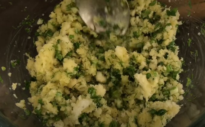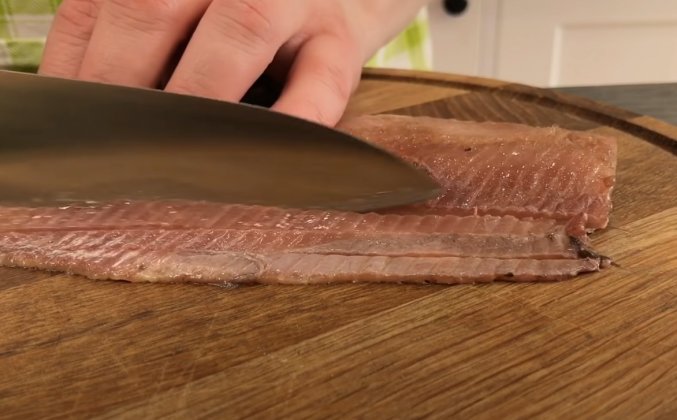 2. Если зелень добавить позже, она будет комками в нескольких местах. А нам нужно распределить зелень равномерно по всему блюду. Заливаем смесь растопленным сливочным маслом. Снова все хорошо перемешиваем. Растопленное масло не должно быть горячим. Я растапливаю масло в микроволновке буквально 2 минуты. Масло не должно закипеть. Посмотрите, все масло впиталось в хлеб. Полученную смесь нужно слегка подсолить. Соли берем совсем немного, потому что будем добавлять соленую рыбу. Если хотите, можете добавить перец. Я не буду добавлять. Все перемешиваем и отставляем в сторону. На крупную терку натираем морковь и вареные яйца. Напоминаю, что морковь я предварительно отварила с небольшим количеством соли и слегка остудила. Теперь мелко нарезаем филе сельди. Сначала я режу филе на тонкие полоски. Филе я получила разделав купленную в магазине селедку. Можно купить уже готовое филе. Можно селедку заменить любыми рыбными консервами - тоже будет вкусно. Тонкие полоски селедки режу поперек на мелкие кубики.