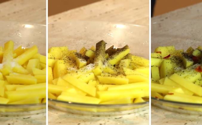 2. Сочетание то еще, да?) Огурцы и мясо. Но, поверьте, как только вы попробуете готовое блюдо - прийдете в полный восторг. Так, половина дела сделана. Теперь две картофелины. Чистим и тоже нарезаем соломкой. Присолим, поперчим и можно немного сладкой паприки. А можно и без нее. Слегка перемешаем. Теперь в горшочки закладываем сначала мясо - до половины. Не нужно утрамбовывать, это вам не женская сумка. А затем оставшуюся часть заполняем картофелем. Сверху еще по ложке сметаны.