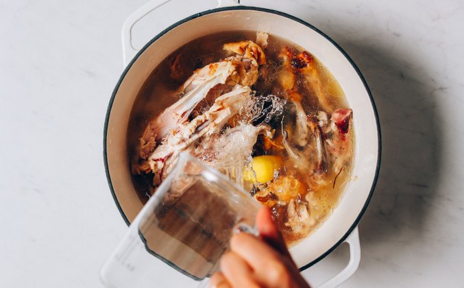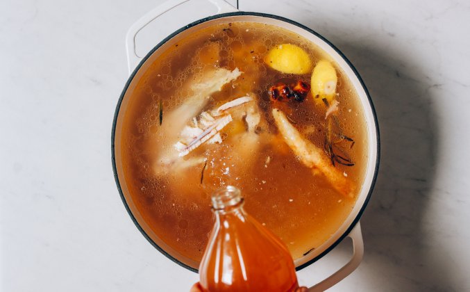 2. Затем добавьте яблочный уксус, который добавляется в основном потому, что кислотность расщепляет коллаген и делает вкус более богатым в бульоне. Вы также можете добавить лимонный сок, но мы предпочитаем яблочный уксус. Довести до кипения, затем уменьшить огонь до низкого и накрыть крышкой. Готовить не менее 10-12 часов или до тех пор, пока бульон не уменьшится на 1/3 до 1/2. Чем больше он уменьшается, тем интенсивнее становится аромат и тем больше будет извлечено коллагена.
