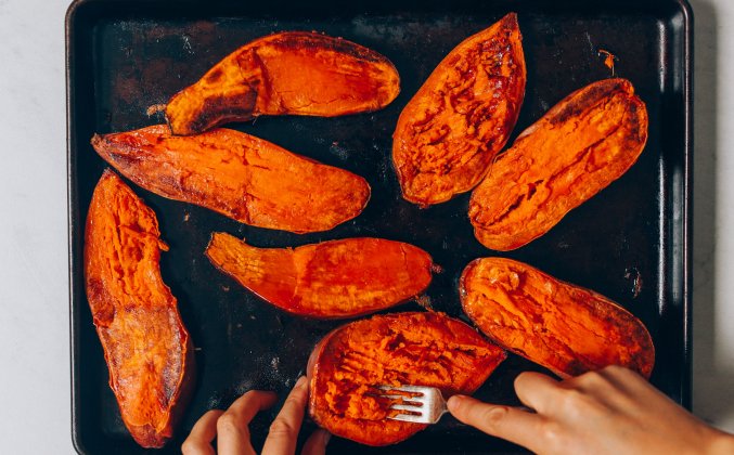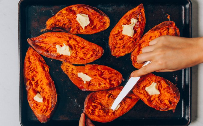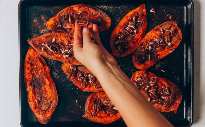 Легкие лодочки из батата (сладкого картофеля) запеченные в духовке, покрыты корицей, кокосовым сахаром и орехами пекан!