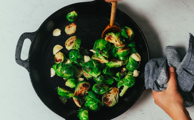 2. Нагрейте большую (не менее 25 см диаметром) сковороду, безопасную для духовки (мы предпочитаем чугун), на среднем огне. После того, как нагреется, добавьте растительное масло (оно должно покрыть дно кастрюли, поэтому добавляйте больше по мере необходимости). Подождите 1 минуту, пока масло не нагреется, затем добавьте брюссельскую капусту. Убедитесь, что сковорода не переполнена - у всех половинок должно быть место, чтобы выложить их лицом вниз, и они не должны быть сложены друг на друга. Если сковорода переполнена, удалите несколько, чтобы приготовить в отдельной партии. Готовьте в течение 2-3 минут разрезанной стороной вниз, чтобы получить шипение. Как только получится золотисто-коричневая корочка, добавьте чеснок, перемешайте и поставьте в духовку.