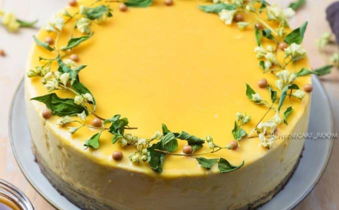 5. После охлаждения снять кольцо и пленку, перенести на блюдо. Украсить по желанию. Можно, например, растопить свой любимый шоколад 100 гр. и сливки 50 гр. в микроволновке, перемешать до однородности и полить полученный ганашем торт.
