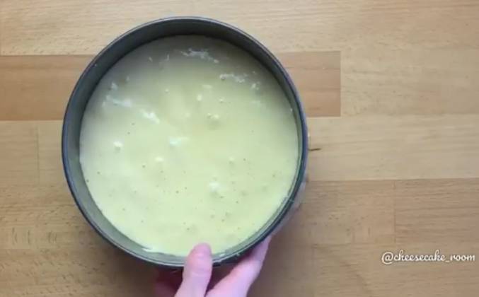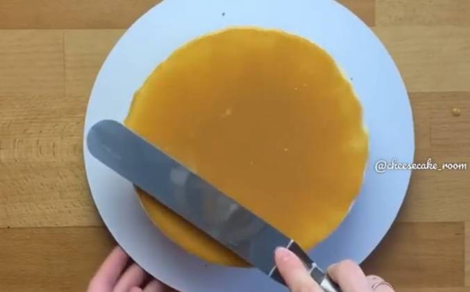 4. Желатин растопить импульсами в микроволновой печи, ввести в сырную массу, очень хорошо перемешивая до однородности. Перелить на бисквит, отправить в холодильник для стабилизации на 8 часов.