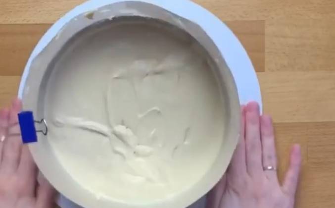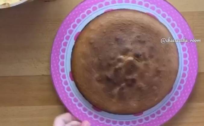 2. Движениями вверх - вниз. Выпекать при 180 градусах 40 минут. Остужаем бисквит при комнатной температуре. Отрезаем верхушку - подравниваем. Форму для сборки застилаем ацетатной пленкой. На дно укладываем бисквит и пропитываем его молоком с помощью кисточки.