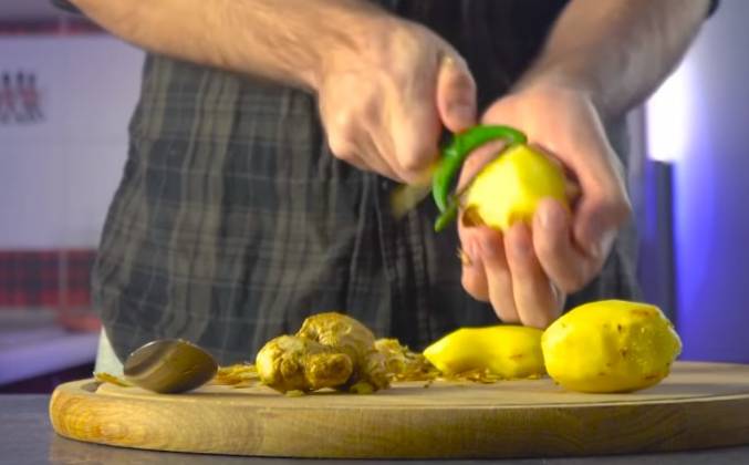 2. Теперь имбирь на очереди. Да ладно? Я лучше травы поем.. 200 граммов имбиря. Слушайте, сейчас цены на него взлетели до небес, ну как у нас умеют.. Чистим его как вам удобно: овощечисткой, ложкой, зубами.. А можете помыть и вообще не чистить, как захотите. Главное — это нарубить его на кубики (поменьше, чтобы не было длинных волокон) Их есть не очень приятно. Это я вам говорю как человек, живущий с Котом. Теперь измельчим лимоны — так будет проще. В итоге, как получите однородную кащицу, закидывайте имбирь. Снова запускайте блендер и до однородности. Консистенция — по вкусу (мне нравится с небольшими кусочками) Ну или ждите пока блендер не начнет дымиться.