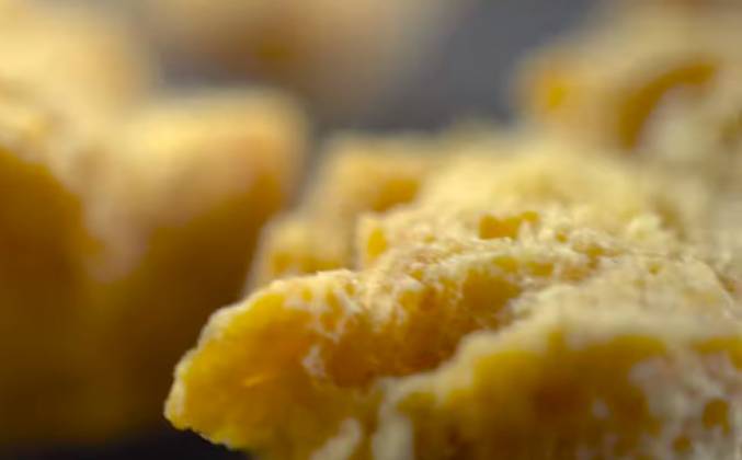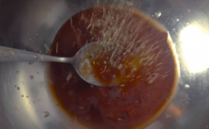 3. Для нее вам понадобится соевое мясо. Вот так выглядят эти маленькие кусочки. Бывают и больше, но эти выглядят как попкорн, так что возьмем их. Ярослав Иванович притащил из магазина, а значит и у вас получится. Отварите их 5-10 минут вместе с свежемолотым черным перцем. И лавровый лист добавьте для вкуса. Процедите через сито. Отожмите лишнюю влагу и дайте им остыть. А далее все по схеме: обваливаете в сушке. Только делайте это быстро. Так как в кусочках сои еще осталось достаточно влаги. Сразу же на противень и в духовку. Температура 230 C — 30 минут. А у нас пока есть время на соус. Для него в миску добавляем 5 ст. ложек кетчупа.