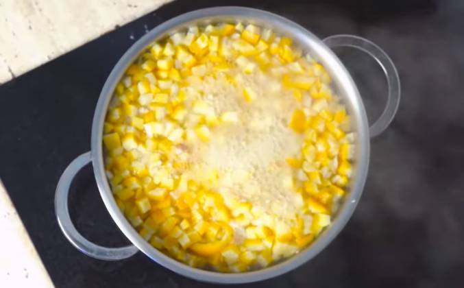 2. Далее порезанные кусочки высыпаем в кипящую воду. И провариваем 10-15 минут на среднем огне. Это нужно для того, чтобы убрать горечь — она уйдет в воду. Процедим через сито, ну а кусочки возвращаем обратно в кастрюлю. Туда же добавляем 250 мл воды — одну чашку то бишь. И 50-200 г сахара. Если собираетесь использовать цукаты в выпечку, то, конечно, 50 грамм сахара будет достаточно. Но если хотите хранить в холодильнике, то 150-200 г — чем больше, тем лучше. Ну чтобы получился сироп, а сахар будет консервантом. Хорошо перемешаем и оставляем на среднем огне на 15-20 минут, периодически перемешивая.