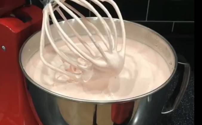 2. Как вода начнёт закипать, добавляем сахар и инвертный сироп. Хорошо перемешиваем. Когда сироп закипит, засекаем время и варим еще 8-10 минут, чтоб температура сиропа поднялась до 110градусов. Либо пользуемся термометром. За 3 минут до конца времени начинаем взбивать наше пюре и белок миксером. Далее медленно, тонкой струёй вливаем сироп, не останавливая миксер.