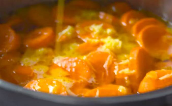 2. Далее сок из 1 апельсина. Конечно, это не обязательно, но так будет намного вкуснее. Мы использовали сито, чтобы косточки не попали в суп. Хотя это было не за чем, в этом апельсине их и не оказалось. Так что жмых из апельсина тоже добавим — не выкидывать же ж.. Натираем небольшой кусочек имбиря — 1 ст. л. уже натертого. Можете заменить сухим — 1/4 ч. л. Доводим все до кипения, уменьшаем огонь так, чтобы еле булькало. Накрываем крышкой и забываем на 30 минут.