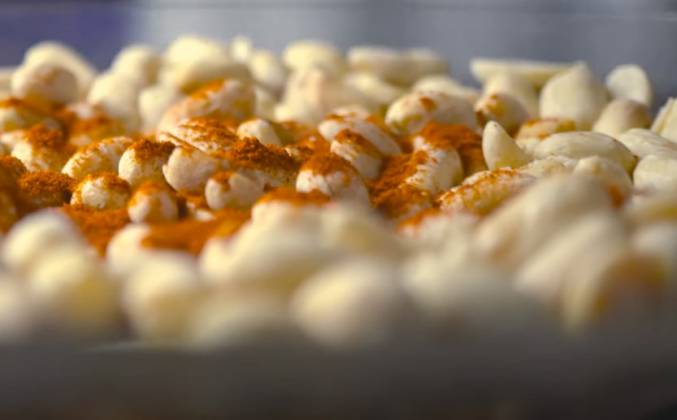 2. А можно то же самое сделать и на сковороде! Поджарьте орехи на умеренном огне до легкой золотистости (постоянно помешивая) После добавляем соль — 3/4 ч. ложки 1 ч. л. с горкой паприки (сладкая, которая) — для цвета и вкуса. Свежемолотый черный перец для пикантности . Если хотите поострее — добавляйте красный жгучий перец — 1/4 ч. л. (но это уже на любителя) Со специями можете экспериментировать — добавляйте что вам по вкусу. Это пора уже изменить.. ГМ: Далее 2 ч. ложки растительного масла (у нас подсолнечное рафинированное) Ну и 1 ч. ложку с горкой кетчупа (тот, что вам по вкусу) Все хорошенько перемешаем.