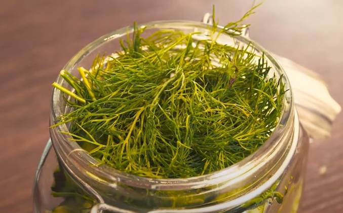 2. Все перекидываем в чистую литровую банку. И накрываем 5-ю веточками укропа. Он сейчас везде. Дальше понадобится чеснок. 3-4 зубка. Хороших таких. Придавите немного. Ну, знаете, как. Котика иногда. *Вызывайте полицию!!* Чеснок очищаем и крупно нарезаем. Добавляем 3 ст. л. уксуса. Мы используем яблочный 6-процентный. Но можно и простой столовый. Соль так же. 3/4 ст. л. Горошины черного перца 20 штук.