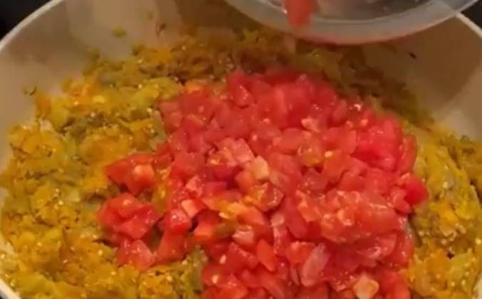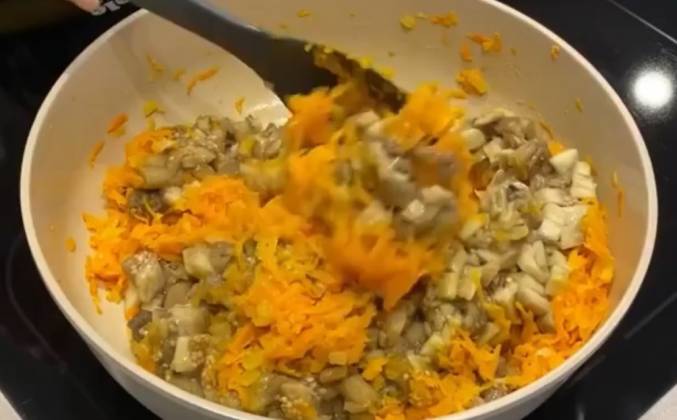 2. Далее добавляем к нему натертую морковь и жарим все вместе минут 10-15. Если это необходимо, подливаем немного масла. С баклажанов снимаем кожу (я показывала в сториз как это сделать), нарезаем их на кубики и добавляем к овощам. Солим все и жарим все вместе ещё примерно минут 15. Далее добавляем к ним помидоры и жарим до тех пор, пока жидкость, которая булькает в икре, испарится. Масса должна получиться гладкой и блестящей.