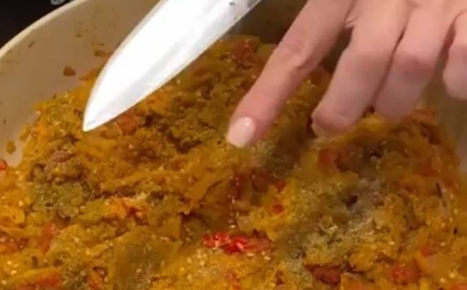 3. Теперь можно добавить специи - куркуму, хмели-сунели, уцхо-сунели и чили. Перемешиваем и добавляем рубленную кинзу и петрушку. Жарим все вместе пару минут и выключаем плиту. ⠀ Теперь можно добавить рубленный чеснок и перемешать. Я на свой вкус впрыснула несколько капель сока лимона, мне показалось, так будет лучше)) ⠀ Ну вот и все! Теперь главное не съесть всю сковородку 😂Видео рецепт ютуб ниже 👇