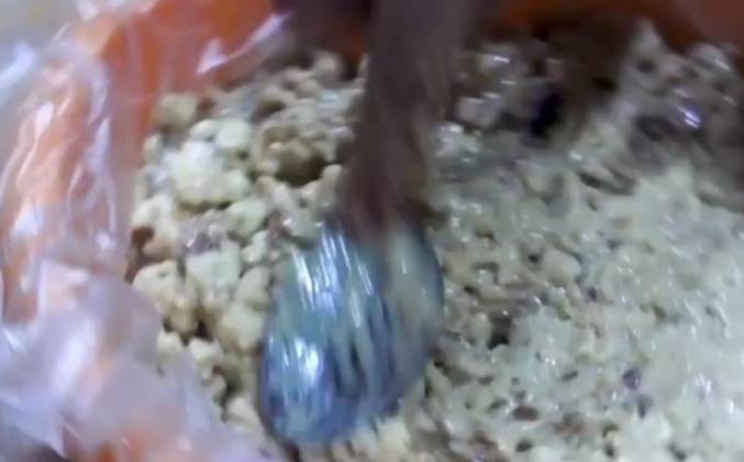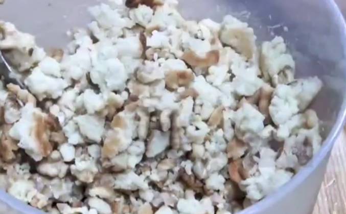 2. Для крема взбиваем варёную сгущёнку, разумеется, я рекомендую её сварить самим, хотя я и слышала, что какие-то производители делают приличную вареную сгущёнку, но тут дело вкуса уже. Добавляем в чашу с кремом наше тесто с орешками, перемешиваем. Берём глубокую, куполообразную чашу/миску, застилаем её внутри пищевой плёнкой (или маленьким разрезанным целофановым пакетом), выкладываем туда нашу массу, утрамбовываем, верх прикрываем оставшейся плёнкой, пакетом.