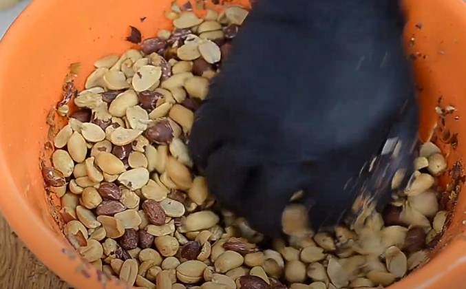 2. Не хочу и вспоминать сколько уходило времени, если чистить каждый орешек по отдельности. Перемолоть очищенные орехи в маленькой (0,5л) чаше блендера до состояния крошки. Скорость высокая. Перемешать ложкой. Добавить масло и соль. Масло поможет арахису быстрее превратиться в пасту. Его не много и ничего страшного в этом нет.