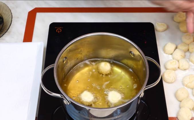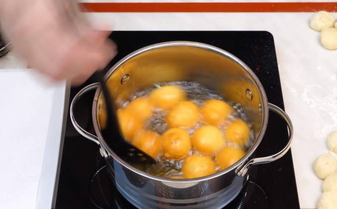 3. В качестве начинки можно использовать вишню или черешню без косточки, густой джем, кусочек шоколада или мармелада. Сразу подготавливаем все шарики, поскольку жарятся они очень быстро и вам некогда будет заниматься тестом. Устанавливаем на плиту неширокую толстостенную сковороду или кастрюлю, вливаем рафинированное растительное масло и даем ему нагреться, но сильно его не накаляйте. Масла в посуде должно быть столько, чтобы шарики плавали и не касались дна. Проверяем готовность масла, насыпав в него щепотку муки - если мука зашипела, можно жарить пончики. Обжариваем творожные шарики небольшими порциями на среднем огне до золотистого цвета. Периодически переворачиваем их для более равномерного обжаривания.