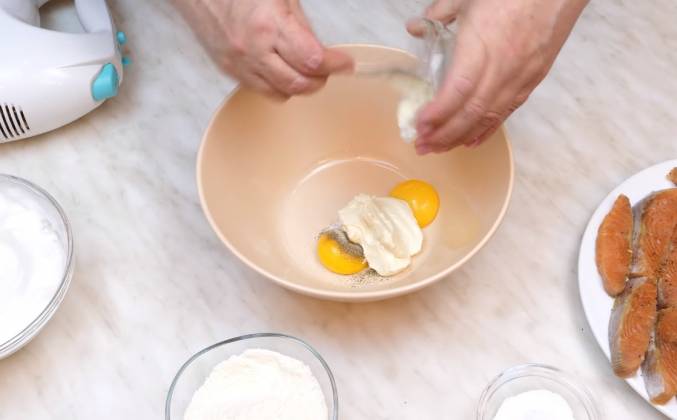 2. Взбитые белки пока отставляем в сторону, они понадобятся нам чуть позже. К желткам добавляем 1/3 ч.л. соли, щепотку перца и 2 ст.л. майонеза, можно взять сметану. Все хорошо смешиваем и всыпаем 1 ст.л. крахмала и 3 ст.л. муки. Перемешиваем до состояния густого теста, а затем буквально по ложке вливаем ледяную воду и каждый раз, тщательно перемешивая тесто до однородности, добиваемся консистенции, чтобы оно было гораздо гуще, чем на блины, но жиже, чем на оладьи, но имейте в виду, что после добавления взбитых белков, кляр станет еще более жидким.