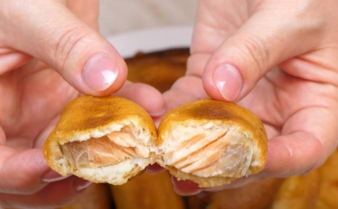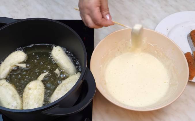 4. Для удобства обжаривания продуктов в кляре можно воспользоваться деревянной шпажкой или длинным кулинарным пинцетом - накалываем кусочек рыбы, опускаем его в жидкое воздушное тесто, даем стечь излишкам и отправляем в разогретое масло. В зависимости от размера рыбных кусочков, обжариваем их на среднем огне примерно по 5 минут до образования золотистой корочки. Обжаривать рыбу нужно небольшими порциями, чтобы кусочки между собой не слиплись. Готовую рыбку выкладываем на бумажное полотенце для удаления излишков масла.Видео рецепт ютуб ниже 👇