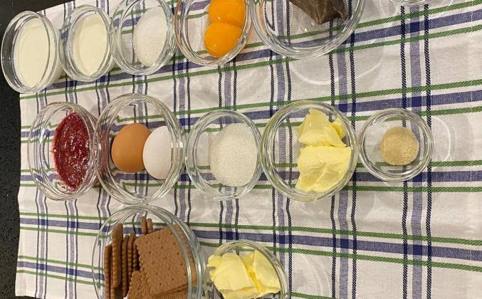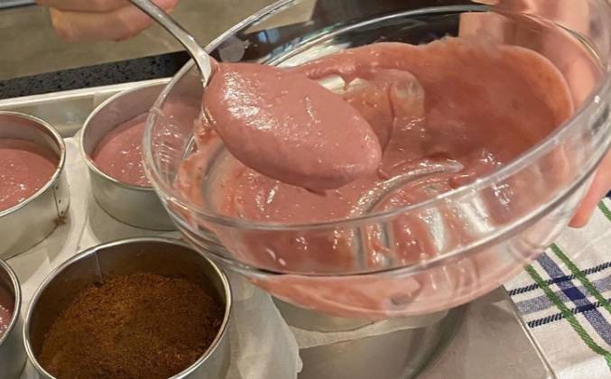 2. Тем временем взбейте яйца и сахар в маленькой миске. Смешайте вишневый сироп с яйцами и сахаром. Эту смесь вылейте в сотейник и непрерывно помешивайте на медленном огне в течение 3-4 минут, пока не загустеет. Желатиновый лист или загущенный желатиновый порошок добавьте к горячей смеси, помешивая до полного растворения. Добавьте кубики сливочного масла и снимите с огня. Когда вишневая смесь остынет, выньте форму с кольцами из морозилки и осторожно распределите массу равномерно в четыре формы.