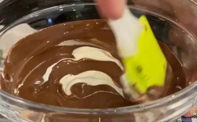 4. Выдавите желатиновый лист или сгущенный желатиновый порошок и перемешайте его с шоколадным кремом до однородной массы. Отставьте для охлаждения на 10-15 минут. Взбейте сливки до мягких пиков, затем возьмите столовую ложку или силиконовую лопатку и хорошо перемешайте с шоколадным кремом до однородной массы. Выньте формы из морозилки и осторожно разлейте шоколадную смесь равномерно по четырем формах. Верните баваруа в морозильную камеру на 30 минут.