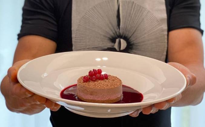 5. Приготовьте вишневый соус. Перемешайте измельчении вишни (150 грамм) с сахаром (2 ст.л.) и выпарить в сотейнике. Процедите через сито. Осторожно выньте десерт из кольца. Соус налейте в глубокую тарелку, сверху осторожно поставьте десерт. Для украшения я использую тертый шоколад и любые красные ягоды, например красную смородину. Приятного аппетита! Наслаждайтесь!