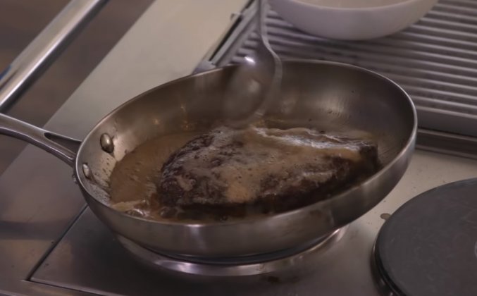 2. Поставьте чугунную сковороду на плиту, используя высокую температуру. Ваша сковорода готова, когда капля воды попадает в нее и сразу же испаряется. Сковорода начнет дымить. Добавьте хороший 0,5 см слой масла с высокой температурой кипения, например, масло виноградных косточек. Используйте свои щипцы, чтобы держать стейк на боку и поджаривать края, следя за тем, чтобы тщательно обжарить любой жир, около 1 минуты. Обжарить стейк с одной стороны в течение 2 минут. Переверните стейк на другую сторону. Добавьте 2 столовых ложки масла в сковороду наряду с раздавленным зубчиком чеснока. Наклоните сковороду, чтобы масло собралось за ручку. Используйте свою ложку, чтобы полить стейк. Снимите стейк со сковороды, когда он достигнет 5 градусов ниже желаемой температуры. Для сырой прожарки его вынимают при 60 °, средне-сырой 65°, средней 70° и хорошо прожаренный - 75°. Используйте цифровой термометр для достижения наилучших результатов. Оставьте стейк на подставке над противнем.