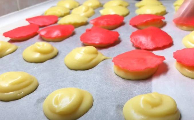 5. На мишки делаю заглушку для того чтобы тесто не вытекало.Перед тем как отсаживать пирожное на пергамент у вас уже должна быть разогретой духовка на 190°. Отсаживаю тесто,делаю небольшого размера кружочки,обязательно на расстоянии друг от друга, так как пирожное растут во время выпекания. Сверку на пирожное кладу подготовленные штройзельные кружочки . Отправляю противень в середину духовке и выпекаем в течение 15 минут при температуре 190°. После этого убавляю температуру на 165° и выпекаем ещё примерно 15-20 минут. Первые 30 минут духовку не открываю так как пирожные могут осесть. Мои пирожные выпекались 40 минут вы ориентируйтесь по своей духовке. Готовые пирожные должны быть очень лёгкими, не капельки не влажные и издавать глухой звук при постукивание. Готовые пирожные оставляем полностью остывать и после этого можно их наполнять кремом.Видео рецепт ютуб ниже 👇
