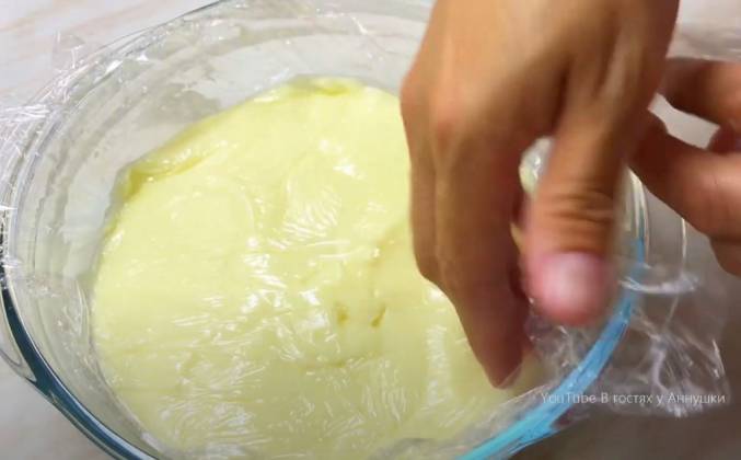 2. Приготовление крема: Молоко ставлю на огонь. Этим временем Сахар,муку,крахмал ,хорошо перемешиваю между собор и добавляю к яйцам . Всё аккуратно перемешиваю до однородности, чтобы не было комочков. Когда молоко нагрелось понемногу вливаю его яичную смесь, вливаю примерно одну третью часть молока, всё хорошо перемешиваем и переливаем яично молочную смесь в посуду с молоком. Ставлю всё это на огонь и варю крем на огне чуть выше среднего, непрерывно помешивая венчиком, варю крем до загустения ,после того как крем загустел варю его в течение 1 минуты и снимаю с огня. Пока ещё крем горячий в него добавляю холодное масло. Хорошо все перемешиваем накрываем крем обязательно пищевой плёнкой в контакт, чтобы не собирался конденсат и крем не завертелся. Убираю крем в холодильник. Для того чтоб он стал стабильным и густым.