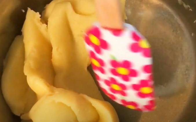 4. Теперь тесто нужно оставить, чтобы это было быстрее его нужно все время перемешивать, когда тесто остынет будет примерно 30 40° это приятная температура на ощупь, начинаем добавлять яйца, яйца я советую пробить блендером и добавлять по две столовые ложки в тесто, добавили яйца перемешать и всё до однородности. Добавляем смело яйца до тех пор пока тесто не приобретёт глянец.Когда тесто становится глянцевым уже нужно аккуратно добавлять яйца. Тесто должно получиться не очень густое, и при этом стекать с лопатки крупной капелькой и не рваться. Смотрите пожалуйста видео каким должно быть тесто. Тесто сразу же перекладываю кондитерский мешок.