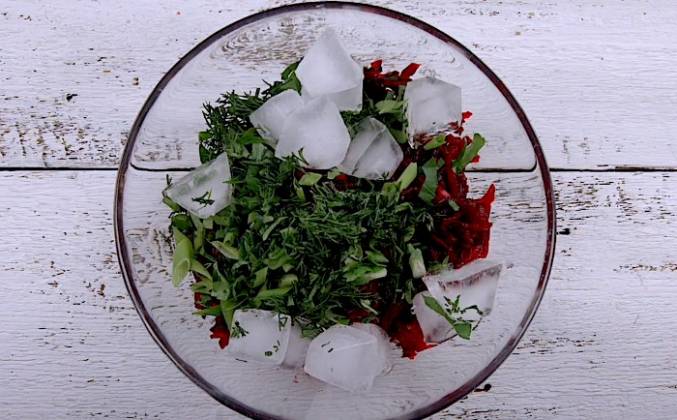 3. Выложи овощи в миску, добавь мелко нарезанную зелень и несколько кубиков льда. Залей всё кефиром, перемешай и посол. Укрась каждую порцию варёным перепелиным яйцом и подавай к столу с печёной картошкой!
