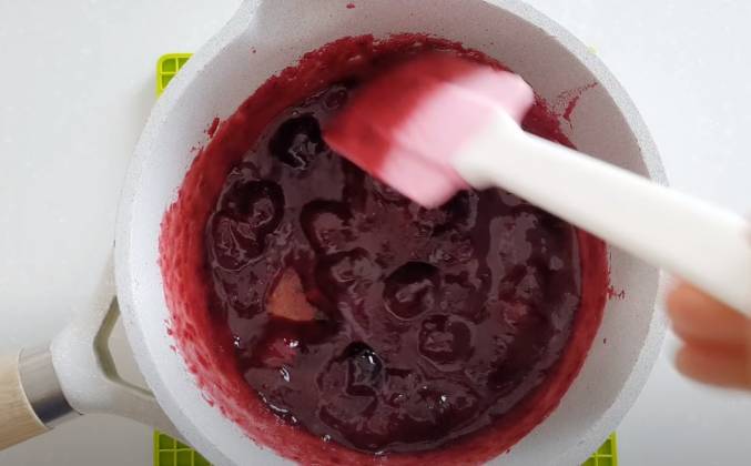 2. Вишневое компоте. Желатин замачиваем в воде на 10 минут. Вишню размораживаем. Сок и часть ягод превращаем в пюре. Ставим на огонь, всыпаем пектин смешанный с сахаром, доводим до кипения и кипятим 1 минуту. Снимаем с огня, всыпаем ягоды. Немного остужаем и добавляем набухший желатин.
