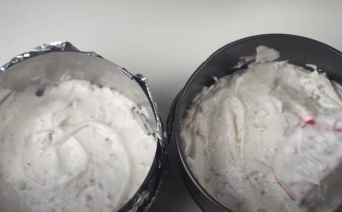 2. Когда белки взобьются наполовину мы начинаем добавлять туда постепенно порциями сахар и взбиваем на максимальных оборотах до устойчивых пиков. Масса должны стать блестящей, увеличится в объёме и держать форму посмотрите вот такая вот масса должна у вас получиться. Во взбитые белки в несколько приема будем добавлять ореховую смесь я условно разделила ее на три части и добавив каждую часть хорошо но аккуратно вымешиваю лопаткой в результате у вас должно получиться воздушное тесто хорошо вымешанное но белки не должны упасть. Раскладываем тесто в подготовленные формы одинакового диаметра. Дно форма я застелила бумагой для выпечки бока формы ничем не смазывала. Хорошенько разравниваем и ставим тесто выпекаться в разогретую до 150 градусов духовку приблизительно на полтора часа. Ориентируйтесь по своей духовке, коржи должны зарумяниться но здесь главное не пересушить иначе они будут очень твердые.